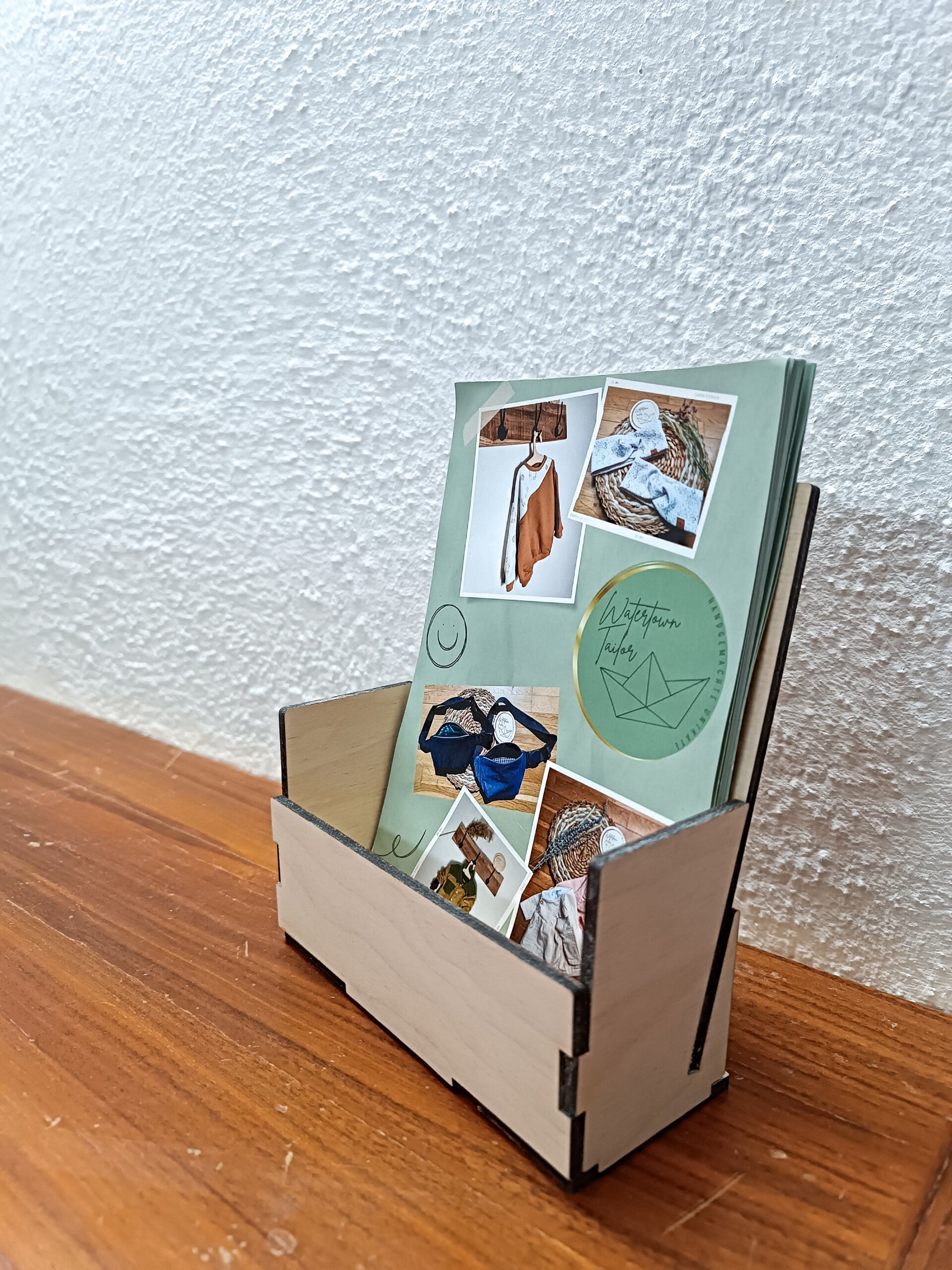 Verleihe Deinen Flyern das perfekte Zuhause – mit einem nachhaltigen und stilvollen Halter aus Vollholz, der Deine Marke in den Mittelpunkt stellt.