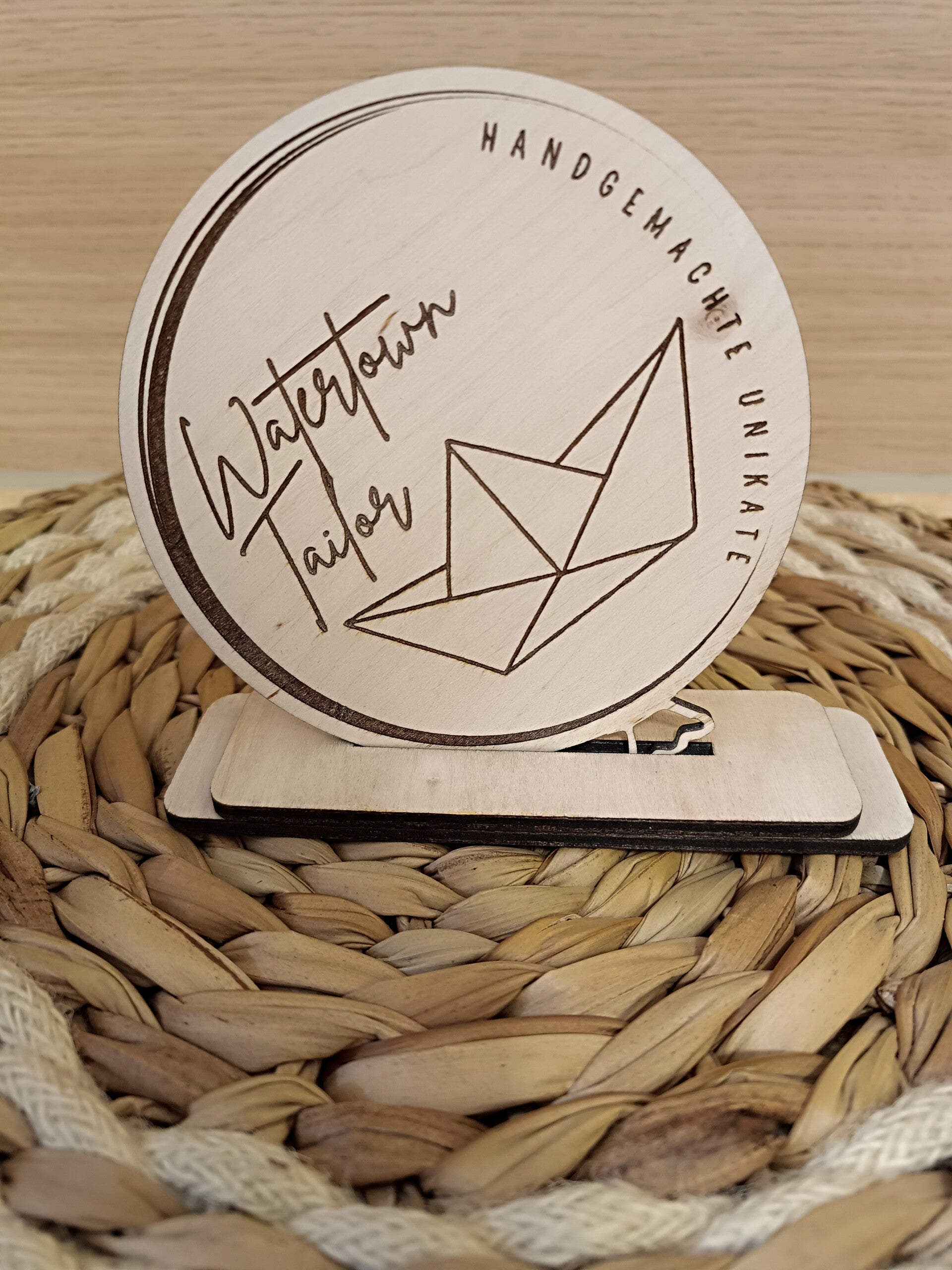 Präsentationsständer erhältlich: Bestellt optional einen Ständer für euer Holzlogo, um es auf Märkten oder in Schaufenstern eindrucksvoll zu präsentieren.